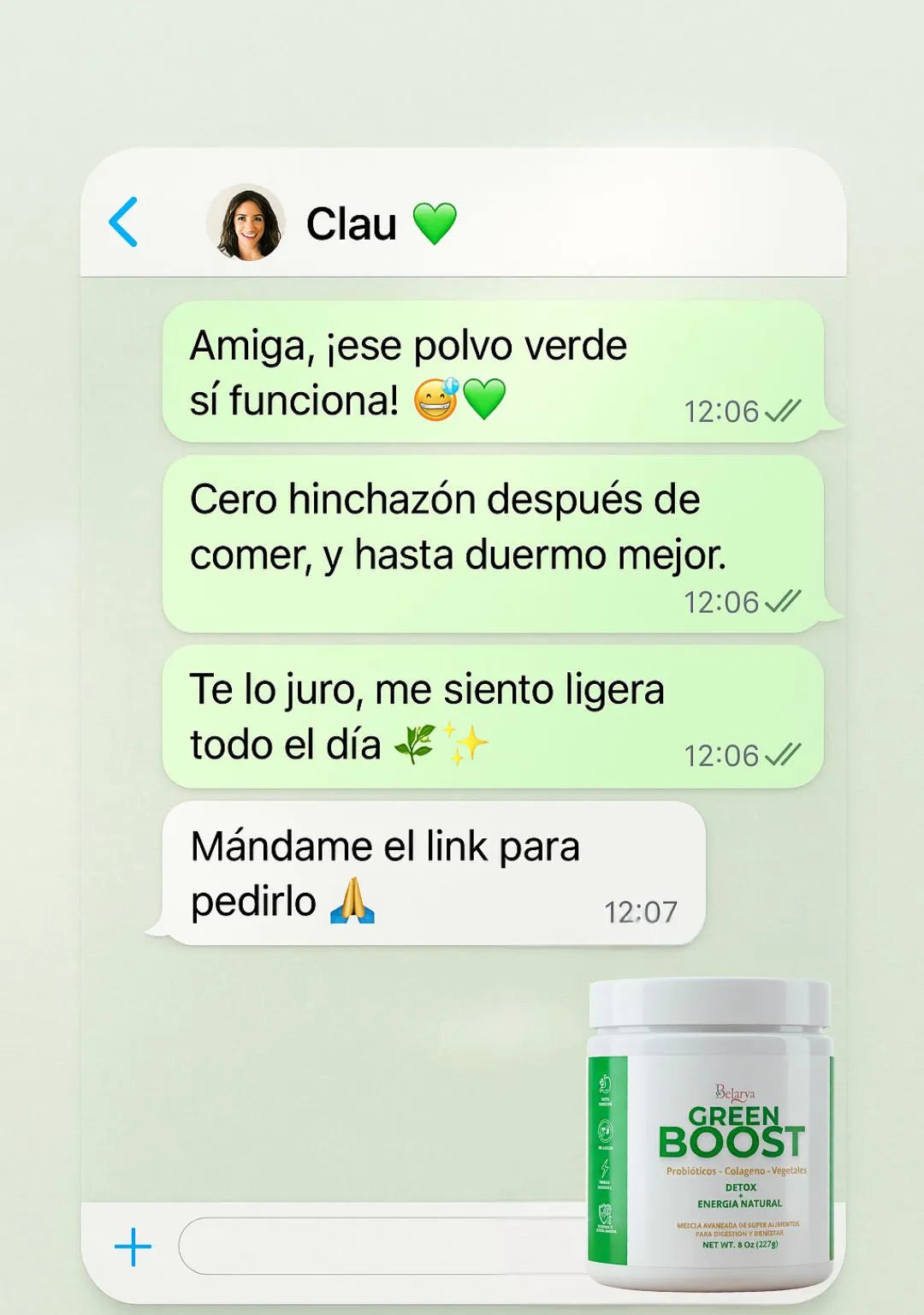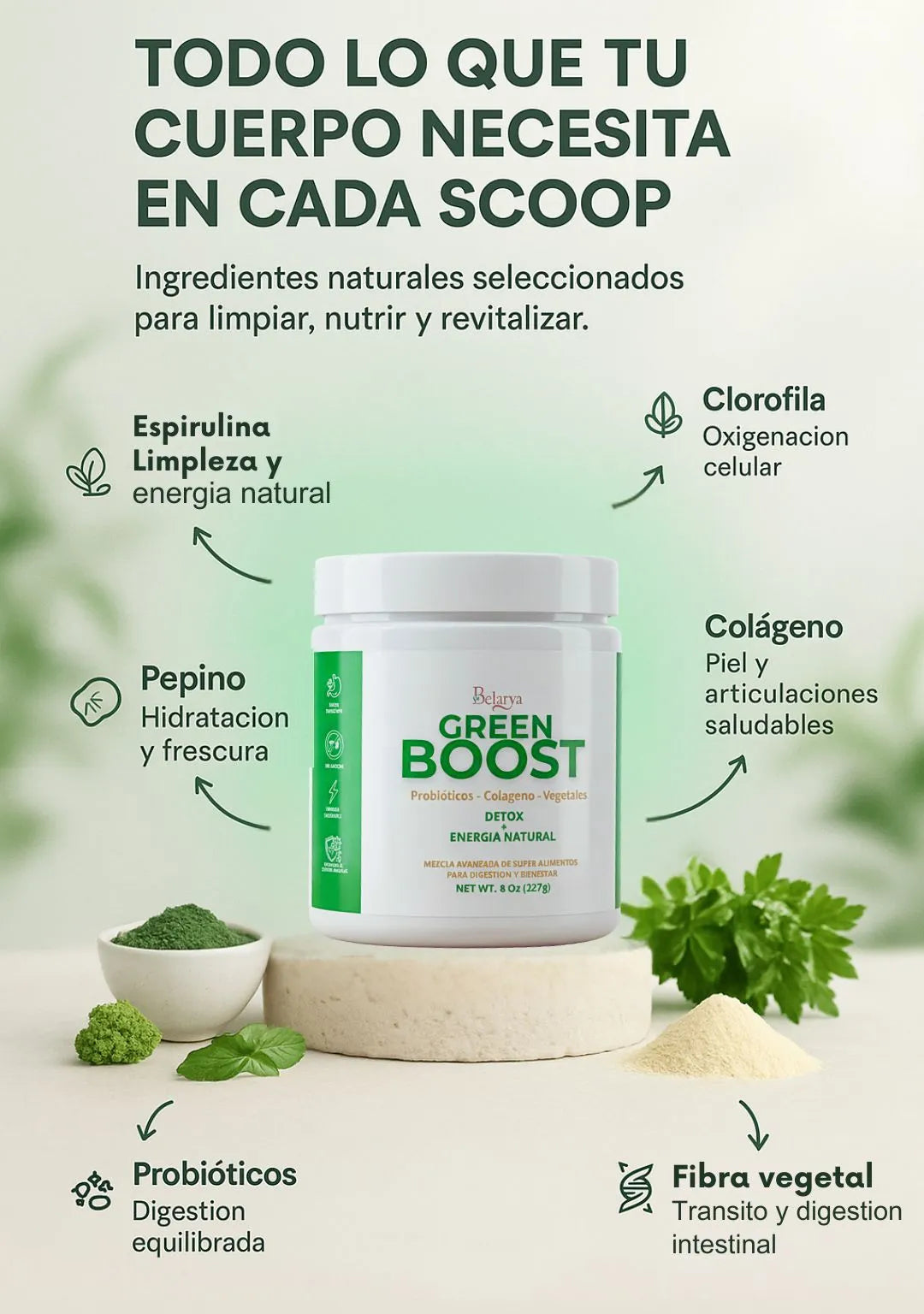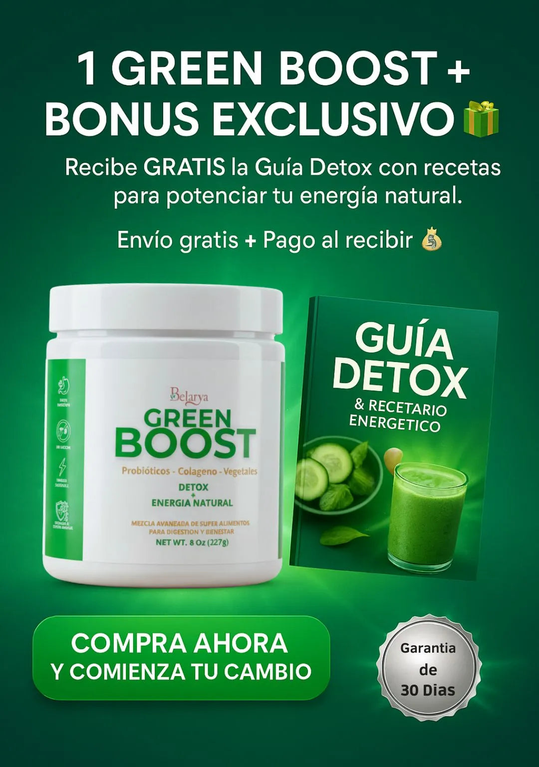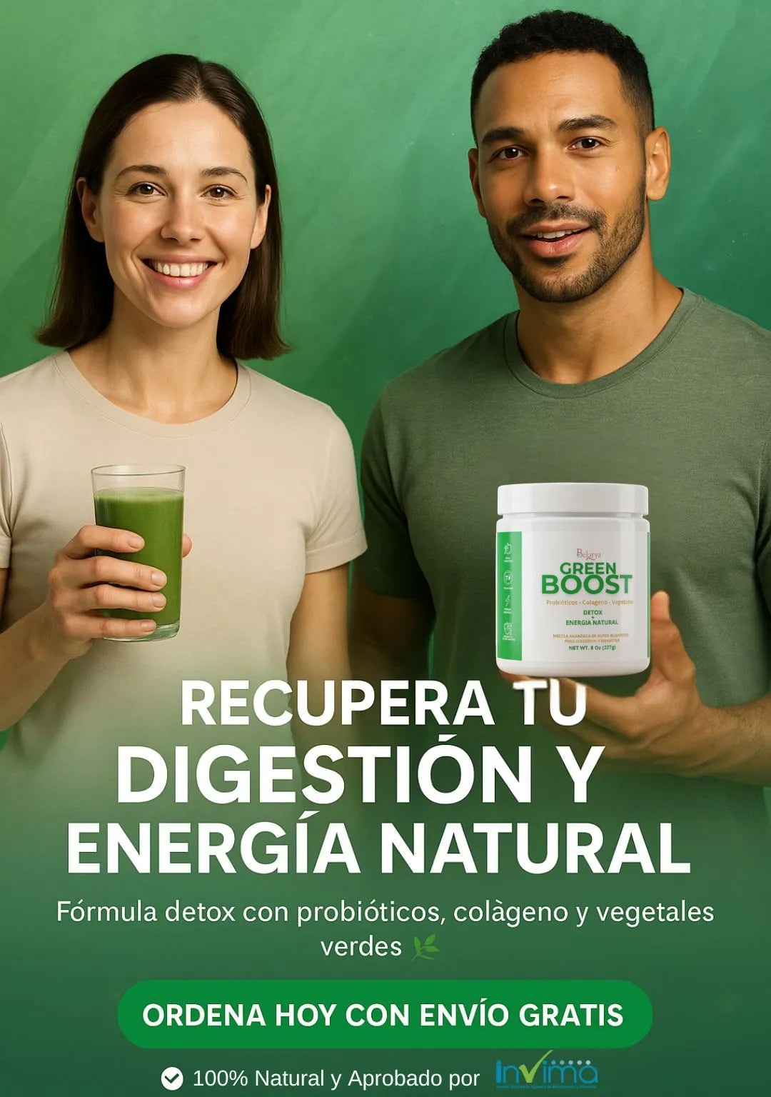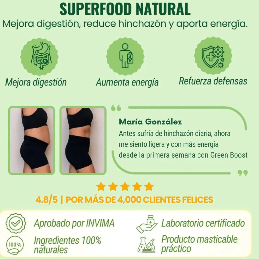 Green Boost es un suplemento natural en polvo elaborado con superfoods como clorofila, espirulina y manzana verde. Ayuda a mejorar la digestión, reducir la inflamación abdominal y desintoxicar el organismo de forma natural.